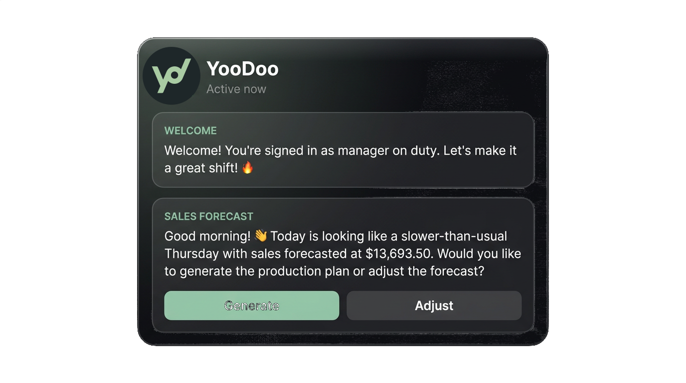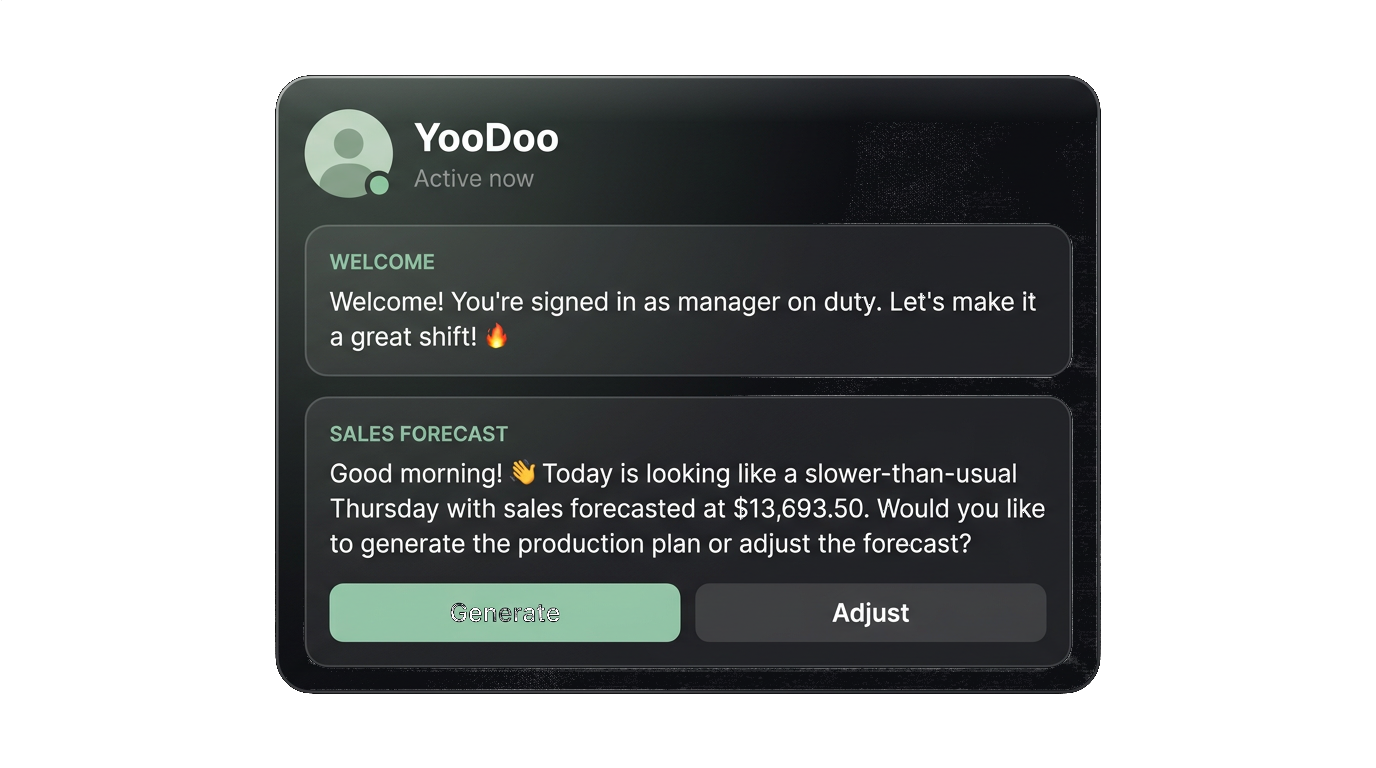 Every restaurant tech company promises a dashboard. Most of them end up as expensive screen savers. YooDoo doesn’t ask managers to learn anything new. It meets them in the app they already check between every table turn: WhatsApp. Demand-calibrated prompts on staffing, prep, and waste: timed to the shift, written in plain language, acted on in seconds.
